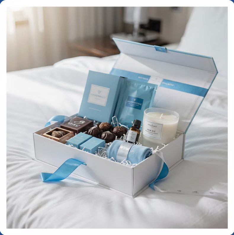 Consider a luxury hotel room drop featuring local artisan treats and premium wellness items. It's not just a gift; it's an immediate immersion into the local culture and a signal of care for the guest's well-being.